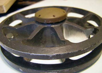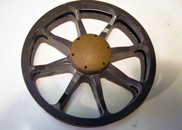 The rear idler's spokes are hand shaped to look more like the real thing. The first two photos are the machined, "as supplied" wheels.