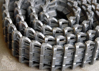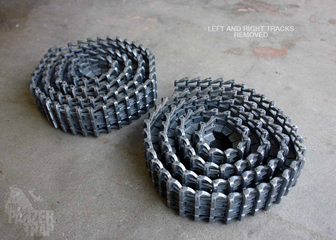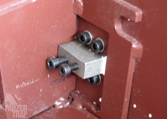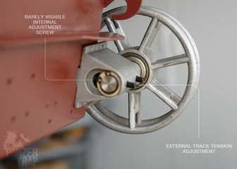 Track tensioning detail. Tensioning is achieved by adjusing both internal and external fasteners to move the idler shaft fore and aft if neccessary.