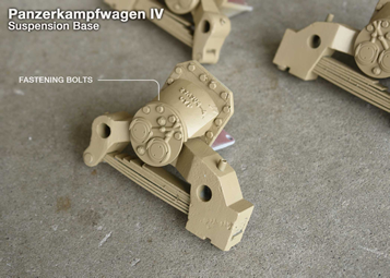 Suspension base final assembly and first, base coat of gelbbraun is applied. In these photos the two mounting bolts that match the fake outer bolts can be seen on each cap. Originally I was going to blend the top of the cap into the base part like the real ones but decided to leave it for easy removal later in the case servicing was required .