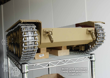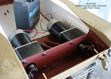Motors are reinstalled and tracks are test run for the first time to check alignment. The motors were simply wired directly to the battery for this test. The interior, electronics layout is being planned and we hope to start on that part of this project soon.