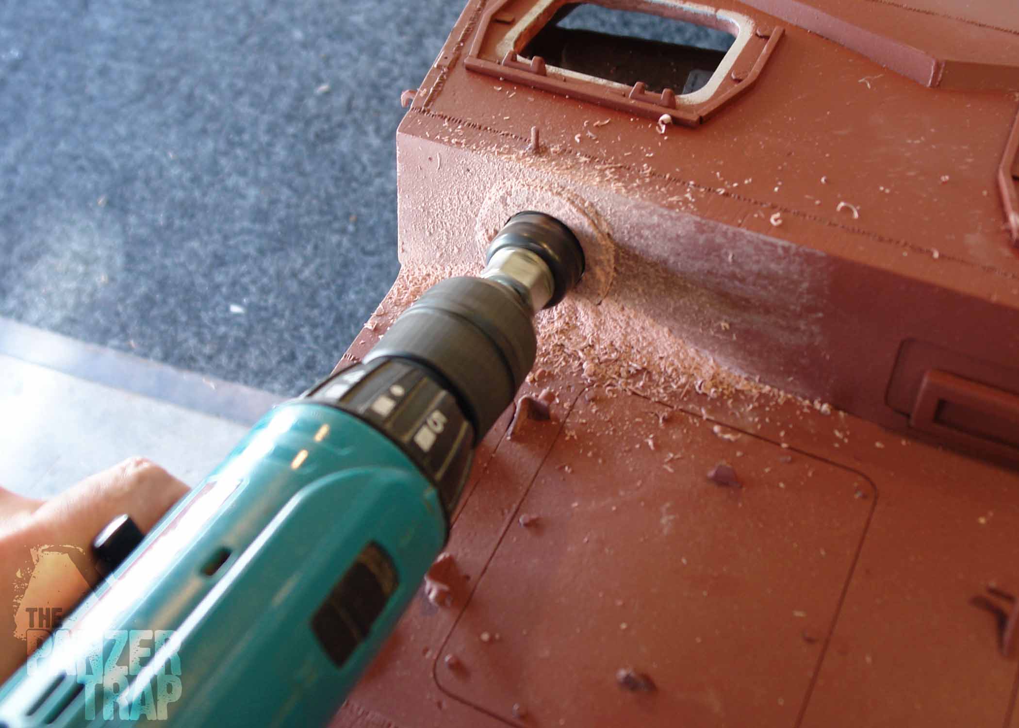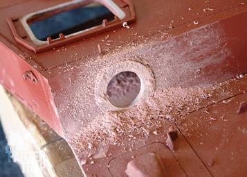 The existing kugelblende is removed and hole is drilled to accept the new, functional version.